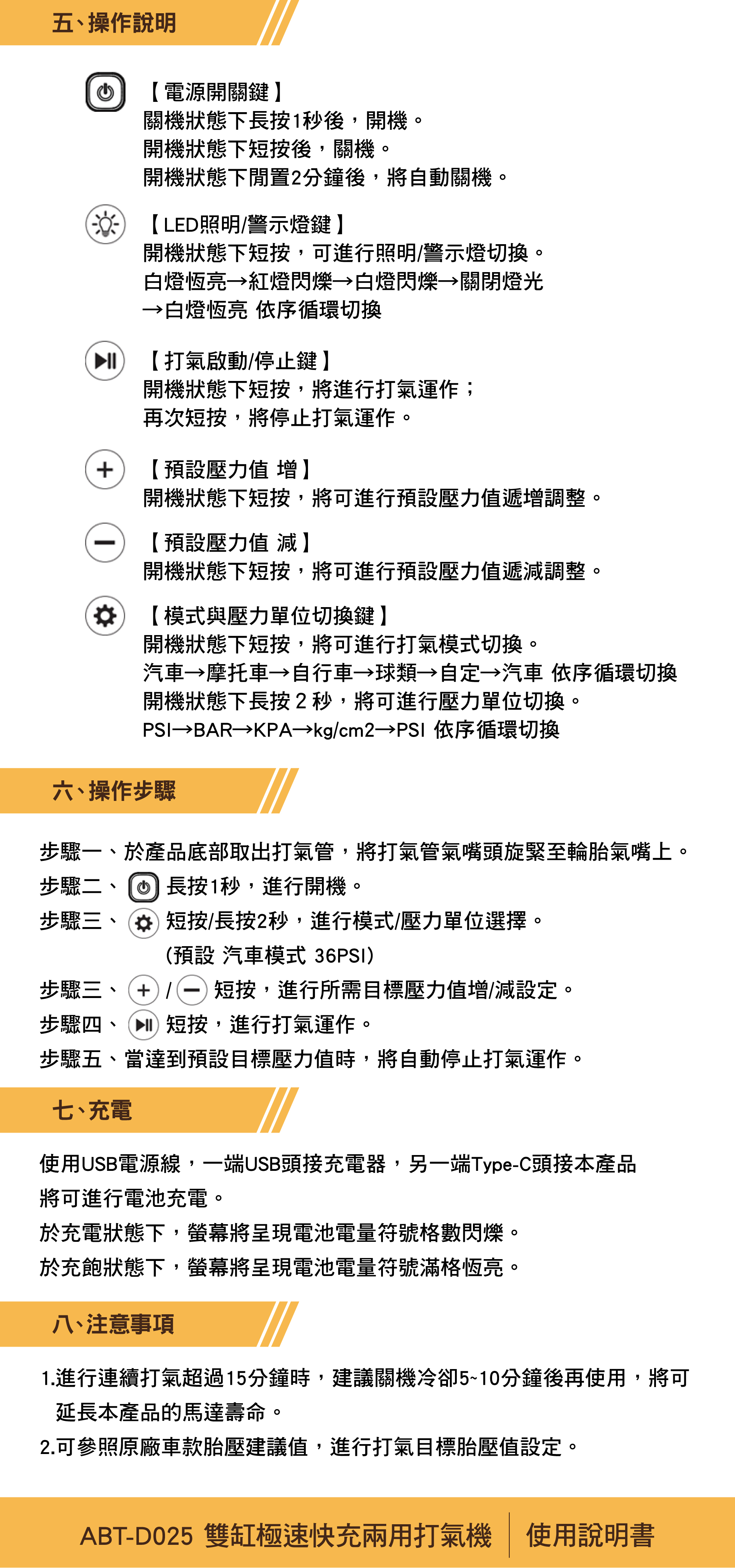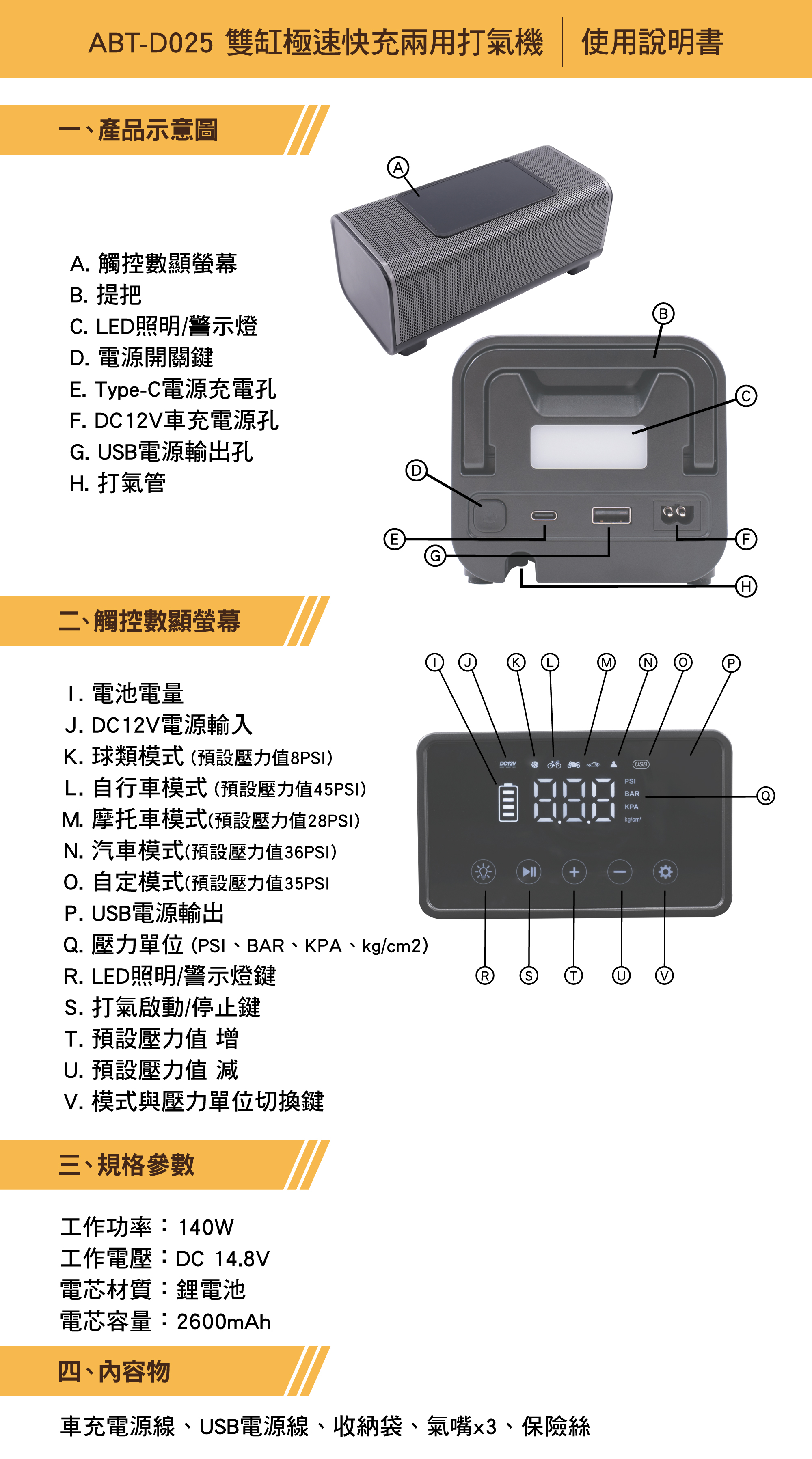 【安伯特】ABT-D025 雙缸極速快充兩用打氣機(無線/有線)-說明書