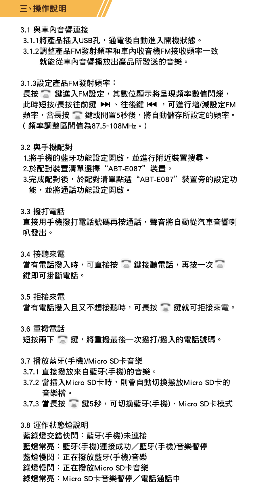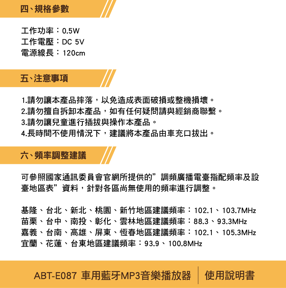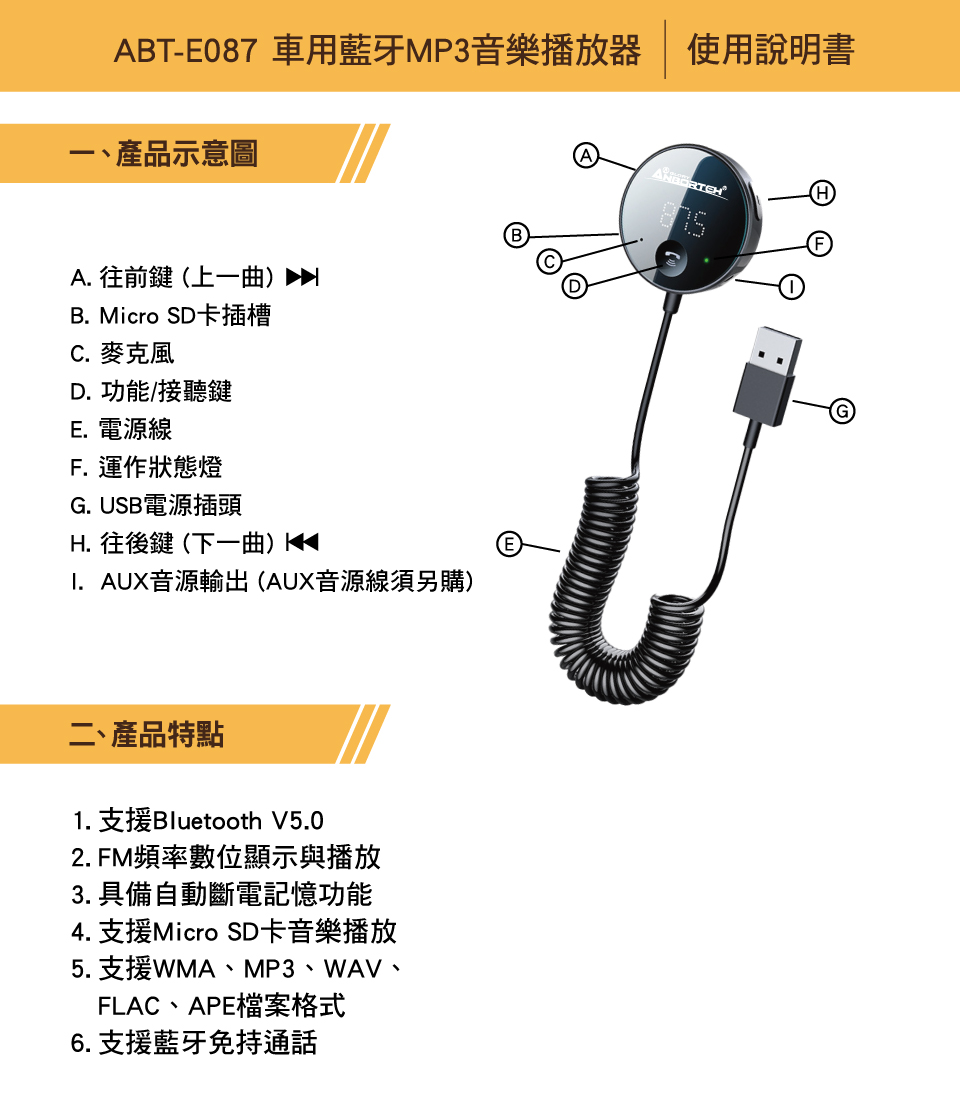 【安伯特】ABT-E087 車用藍牙MP3音樂播放器-說明書