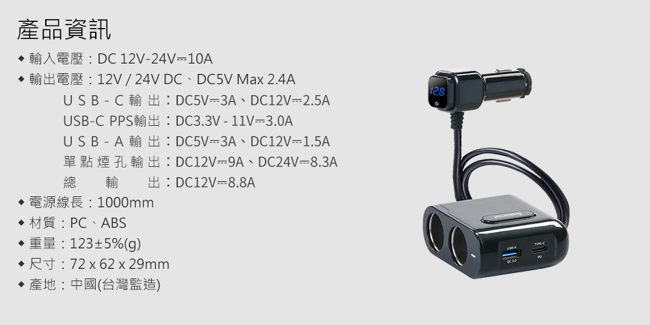 USB-A輸出:DC5V⎓3A、DC12V⎓1.5A